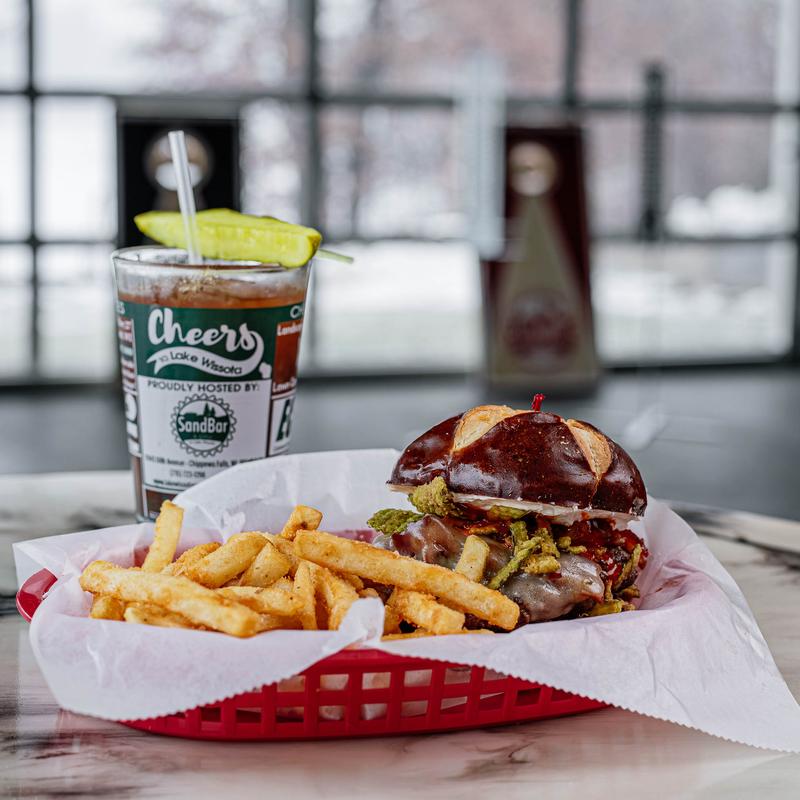 1/3 pound burger on a pretzel bun topped with bacon, white & yellow cheddar cheese slices. cheese curds, dunked in a bowl of beer cheese soup with a side choice.