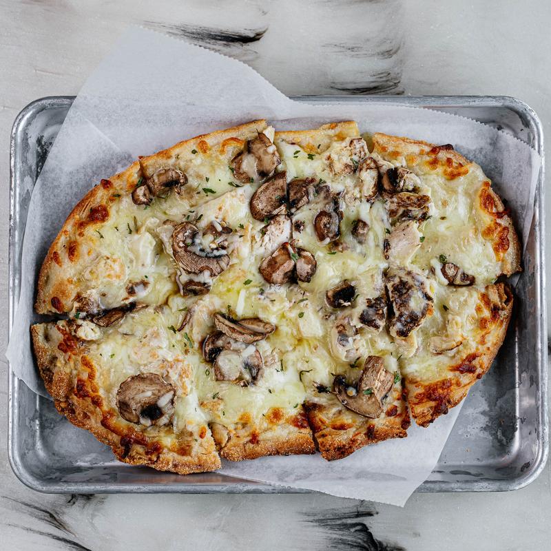 Pinza flatbread topped with garlic butter, grilled chicken, mushrooms, parmesan cheese, and mozzarella cheese.