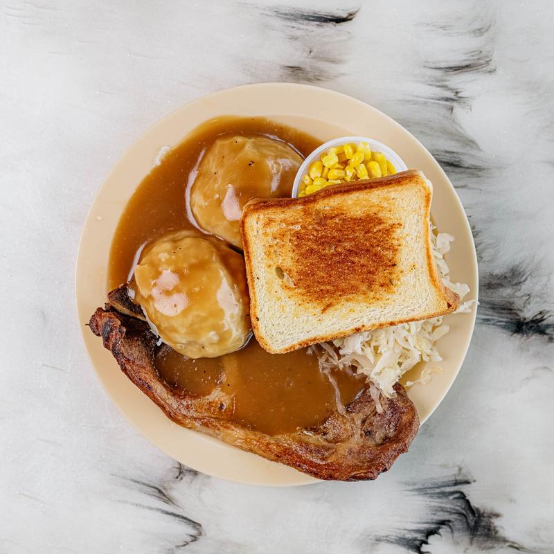 Ten-ounce tender pork chop fritter, breaded and deep-fried golden brown, served over pickles and topped with Dijon mustard aioli on Texas toast with a choice of side.